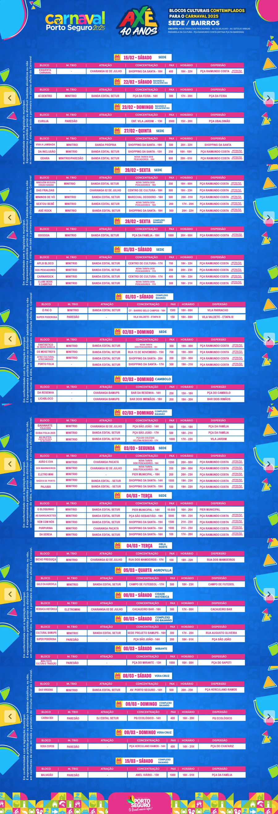Toda programação 2024-2025 em Porto Seguro, Arraial d'Ajuda, Trancoso, Cabrália, Belmonte, Caraíva: Festas, baladas, shows, semana do saco cheio, São João, Outubro Folia, Reveillon, Carnaval, luau do Tôa-Tôa, Axé Moi, Ilha dos Aquários...